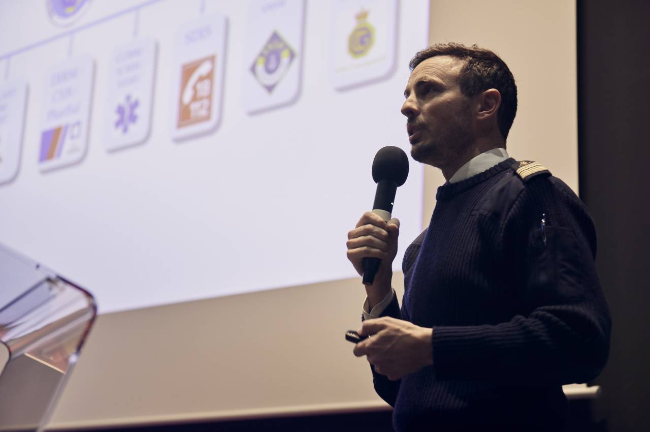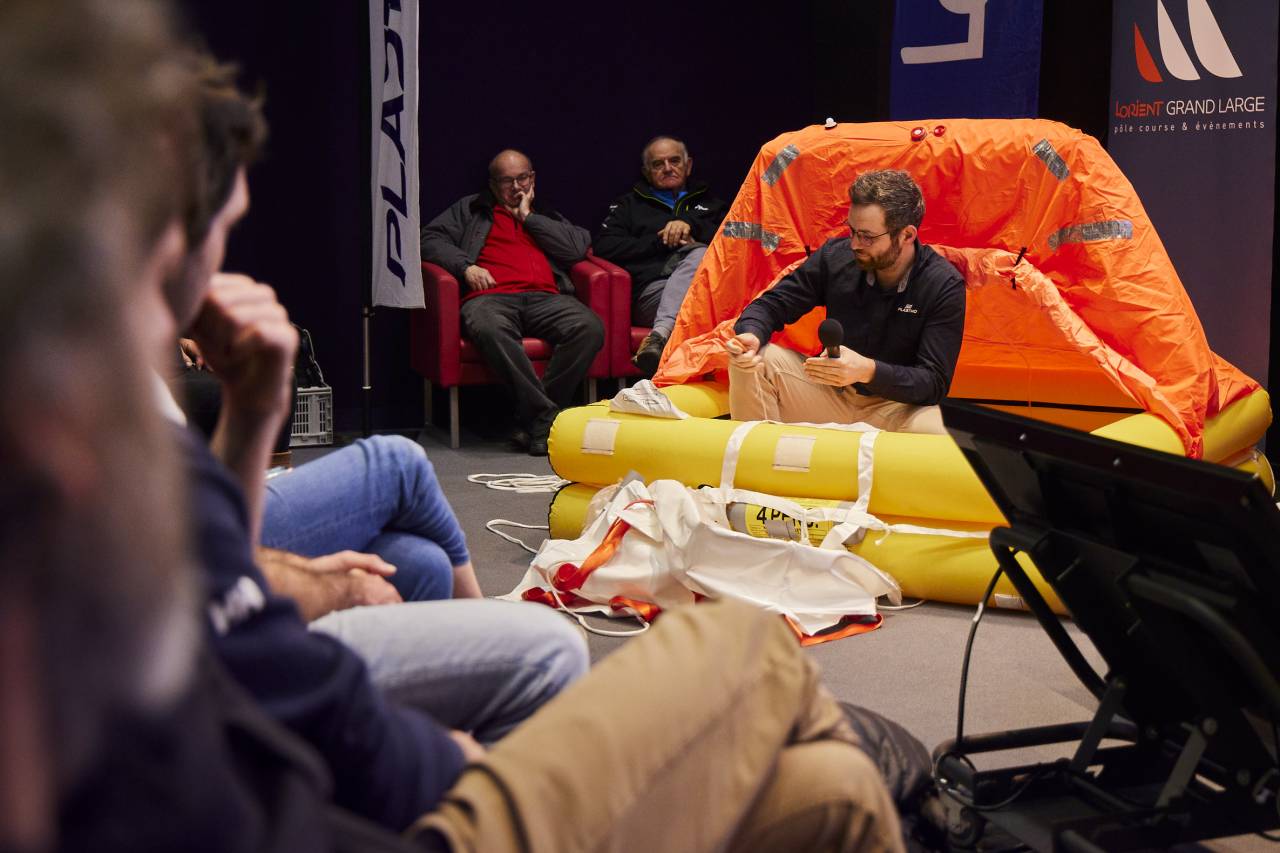 En attendant le suivi de l’évolution des fichiers météo et une prise de décision, les coureurs ont assisté cet après-midi au traditionnel briefing « sécu », animé par l’organisateur Lorient Grand Large, Plastimo, le CROSS d’Etel et la flottille 24F de Lann-Bihoué. Christophe Brière, administrateur LGL dédié à la PLM : « Ce briefing a pour objectif de présenter la gamme des équipements de sécurité et de rappeler la conduite à suivre en cas de crise ».