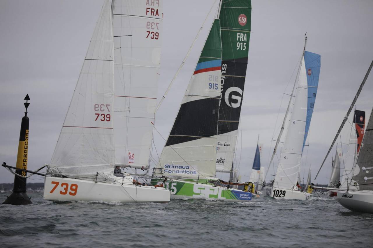 Après un léger report d’une demi-heure, le temps de laisser passer quelques derniers grains, la flotte des 85 Mini s’est élancée ce jeudi, à 10h36, dans 12 à 15 noeuds de vent d’ouest nord-ouest, sur une belle mer malgré une légère houle résiduelle d’après-front.